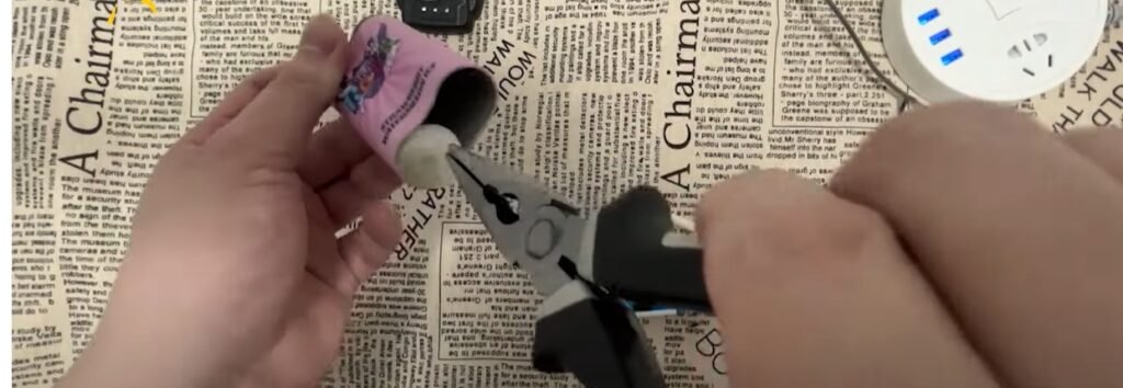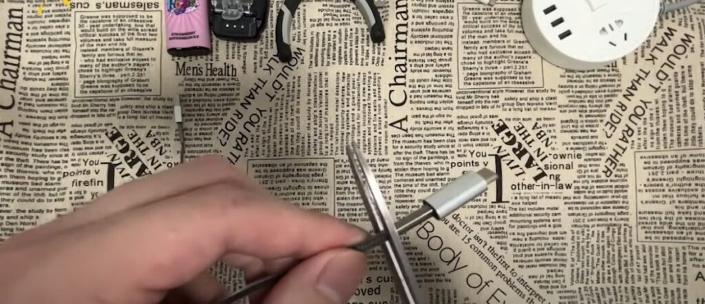 Take a rechargeable charging cable, and after confirming that it can be charged, use scissors to cut the charging cable. And cut the insulating rubber wrapped around the charging cable.