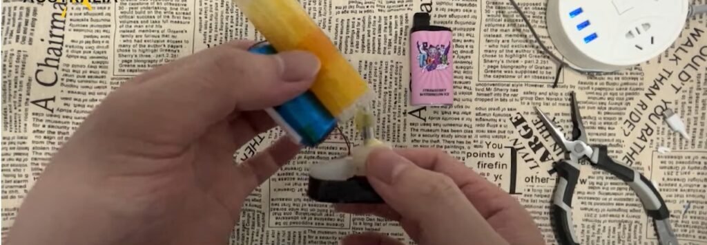 Use the previously processed charging cable, select the red and blue wires. Use glue to stick the red wire on the positive pole of the charging cable and the blue wire on the negative pole.The charging time is about 2-5 minutes. After charging, reinstall the battery and e-liquid according to the previous steps.Try to suck, if there is no problem, the charging process of iget is completed.