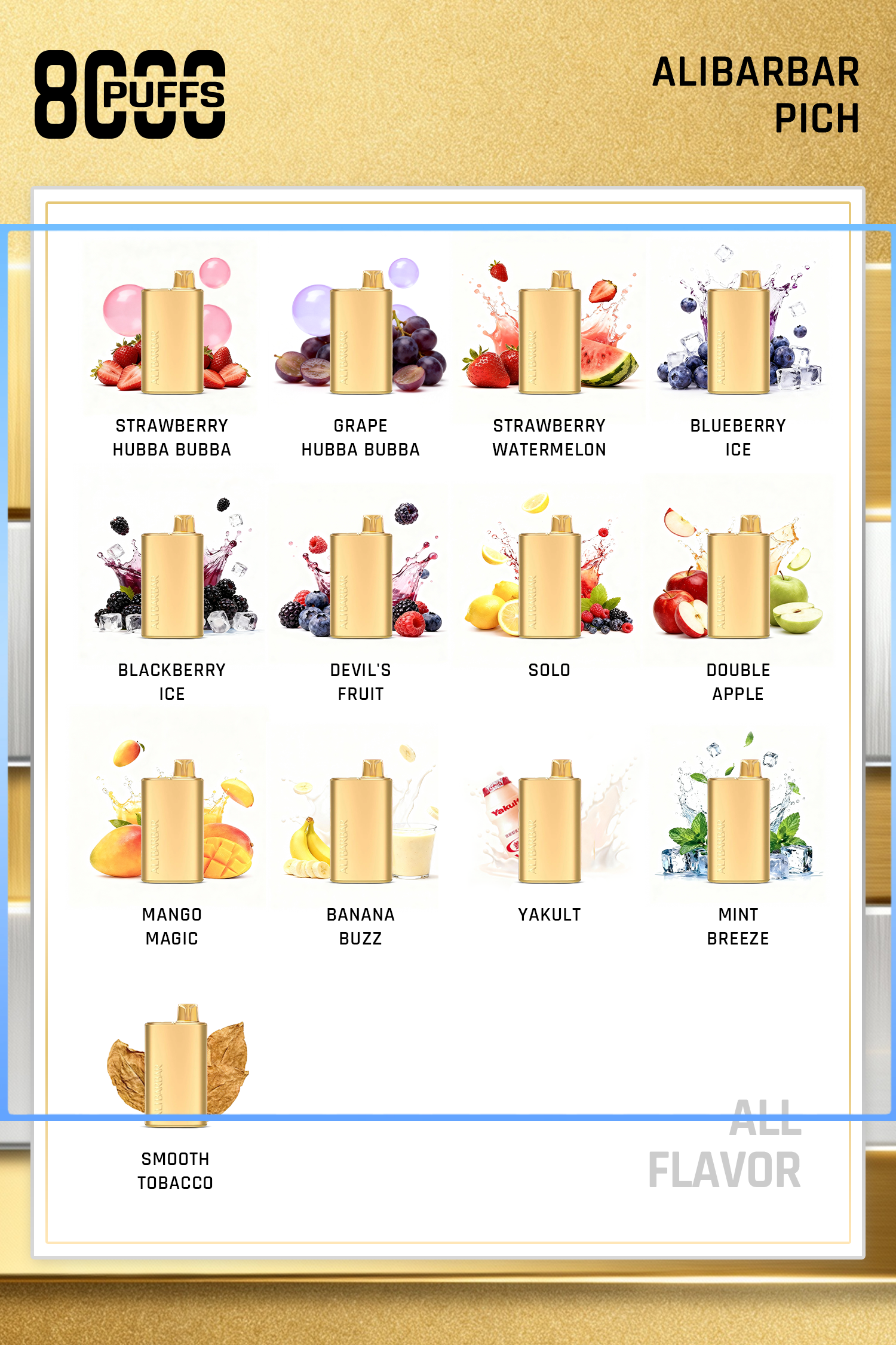 Experience Our New AliBarBar Rich , The cutting-edge disposable Device with 8000 Puffs more puffs, AliBarBar Rich Offering better flavor consistency and smoother draws than regular mesh. AliBarBar Rich features a transparent a premium metallic design, and 20mg/mL concentration. Elevate your vaping with enhanced longevity and superior flavour. AliBarBar Rich Featuring a sleek and compact design measuring 86.9x45x22.4mm and weighing only 95g, it resembles a stylish cigarette, perfect for on-the-go use. AliBarBar Rich premium metal shell and curved design at every angle provide a soft and comfortable grip.